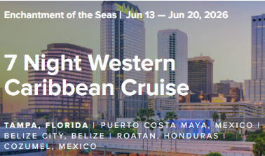 Here’s your chance! For our 10th anniversary next year, we will be taking a seven-day cruise from Tampa on the Royal Caribbean Enchantment of the Seas departing Saturday, June 13. The ship will stop in Costa Maya and Cozumel in Mexico, Belize City in Belize, and Roatan in Honduras. We have reserved a block of rooms and have a travel agent ready to help you book your cruise with us. The details are as follows: